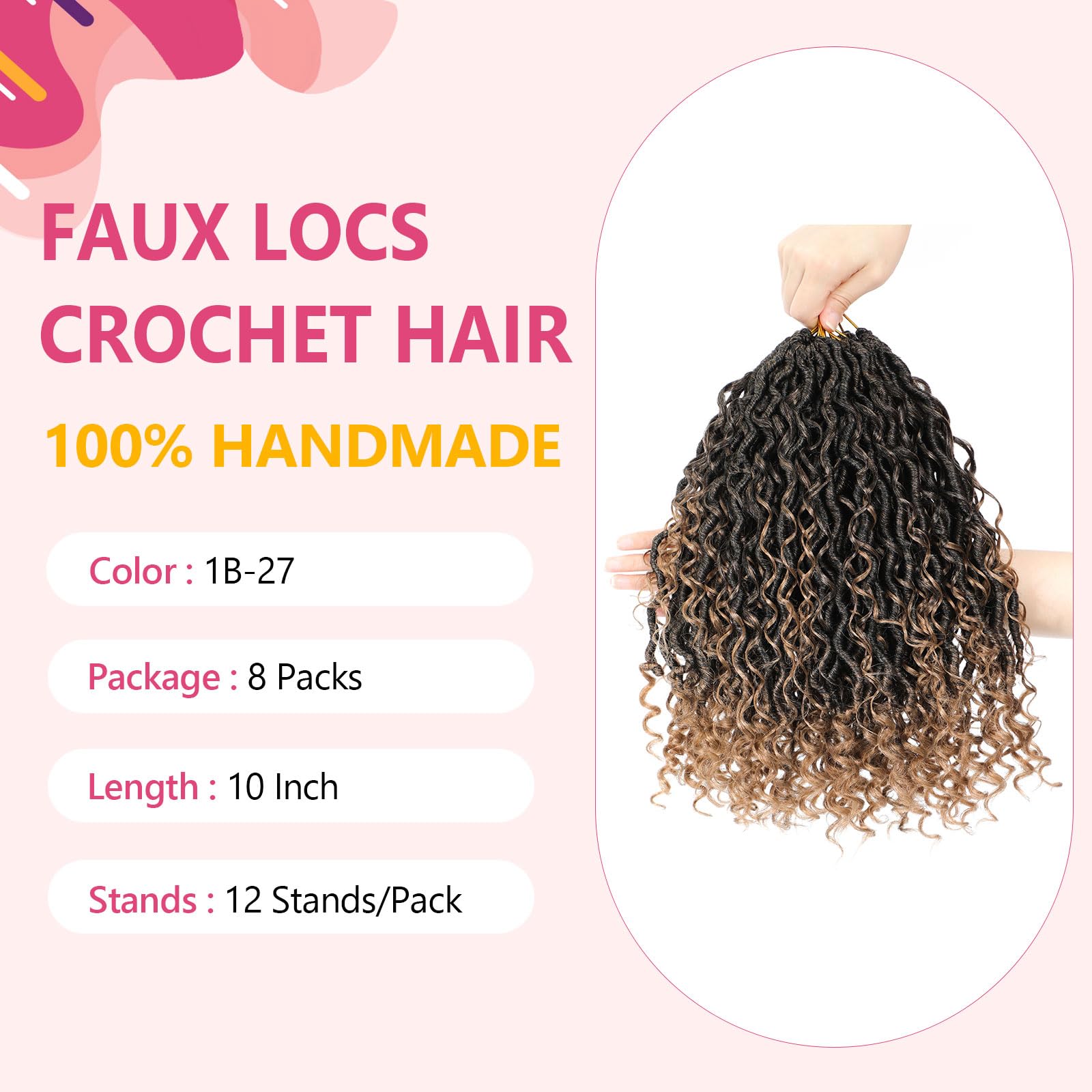 - Package -- 8 Packs boho faux locs crochet hair, 12 strands /pack, Usually 6-8 packs crochet locs are enough to full a head. Handmade goddess locs crochet hair comes in variety of lengths and colors, allowing you to customize your look and style.
