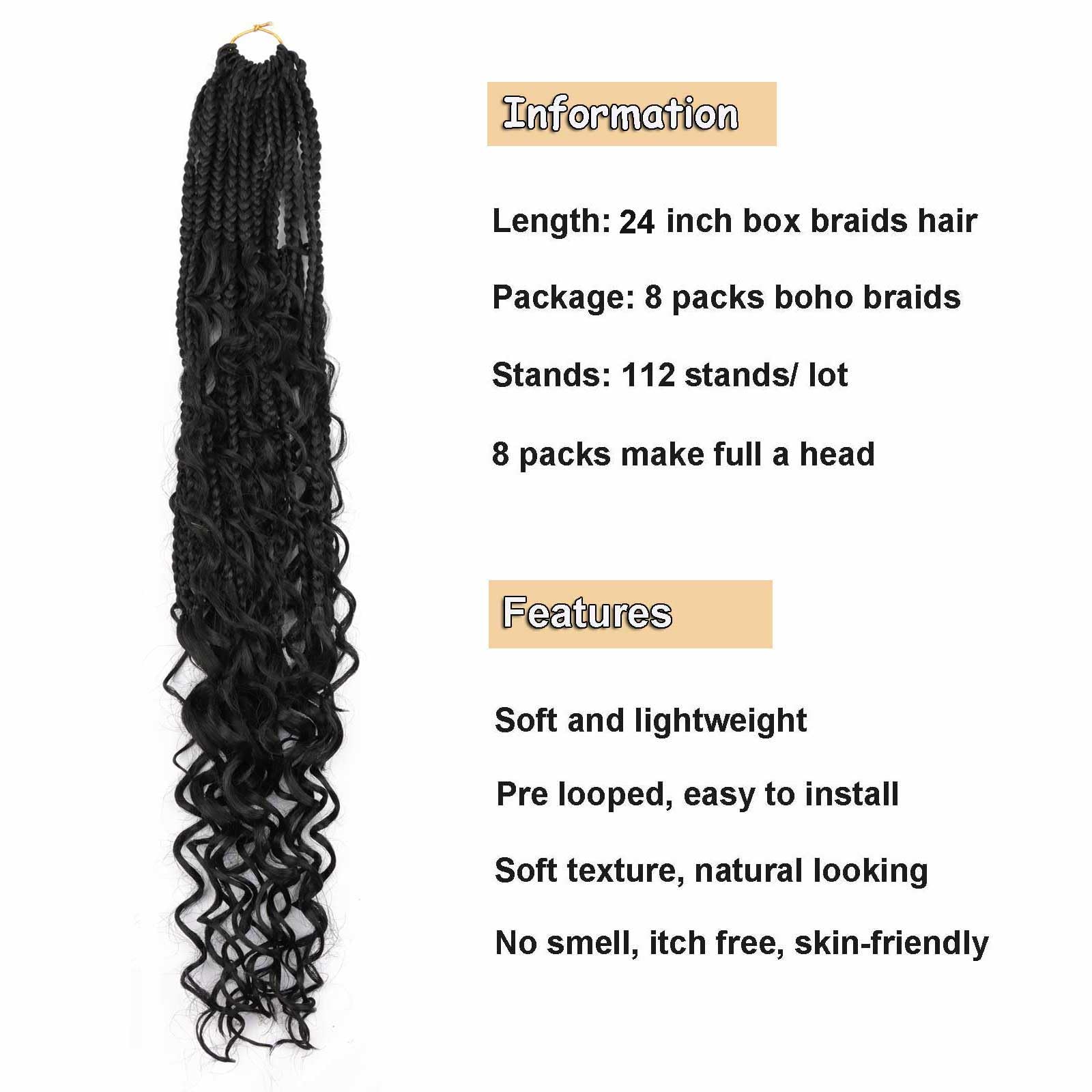 - Boho Braids Packing: Each pack contains 8 packs pre-looped Box braids hair , with a total of 112 strands. Typically, 6-8 packs are sufficient for a full head.