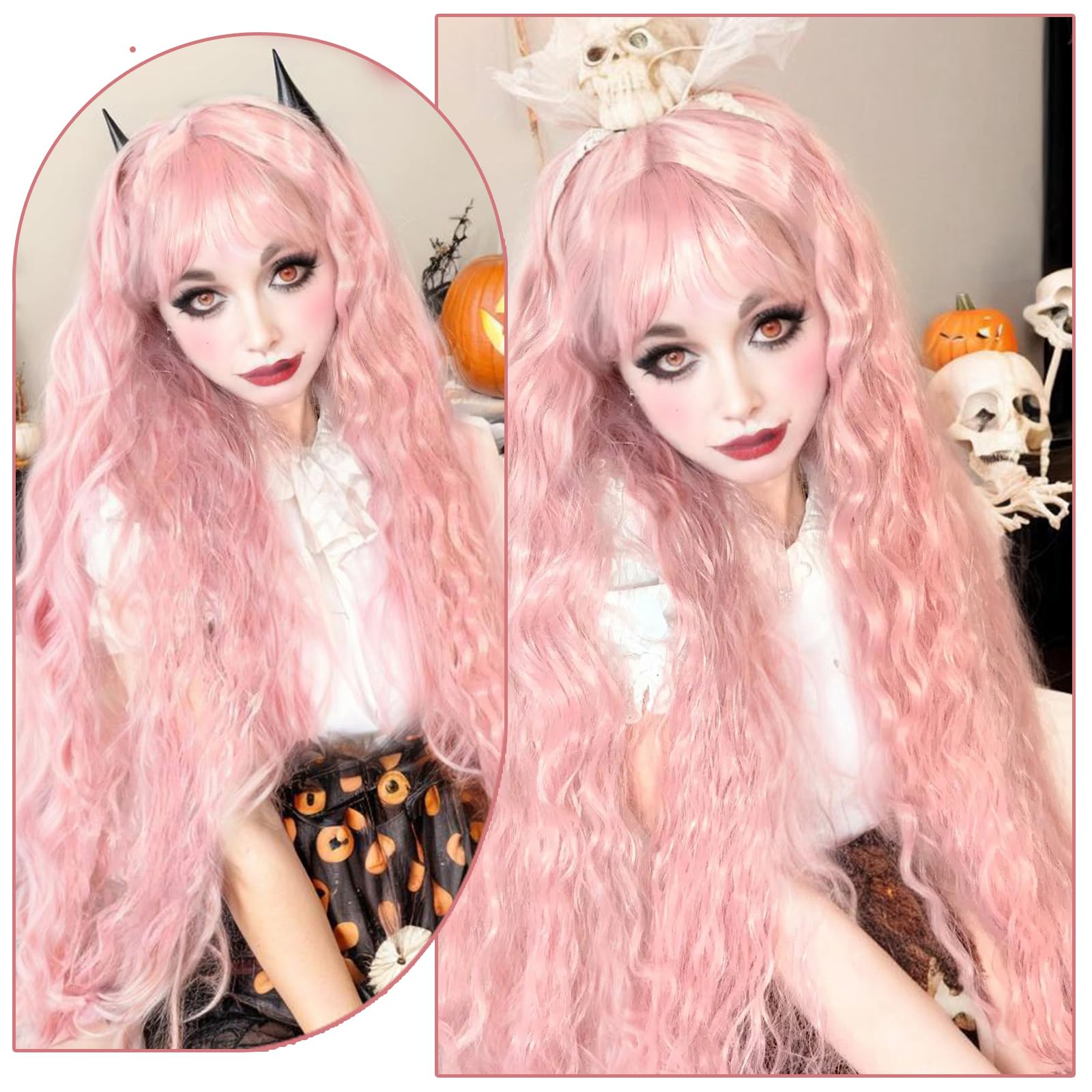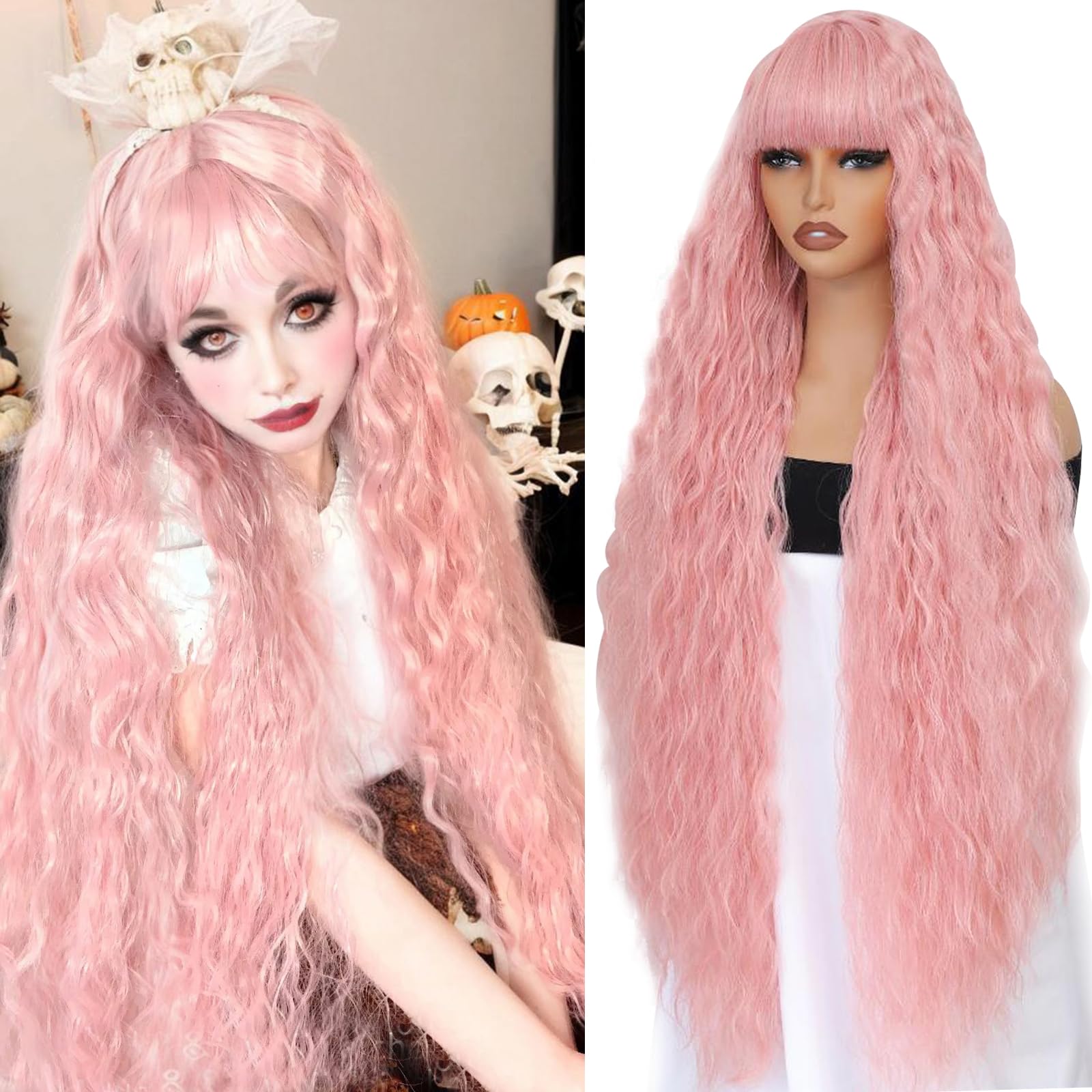 Aliesencia 40 Inch Long Wavy Wig with Bangs for Women White Cosplay Wig Bounce Fluffy for Halloween Party Daily Use(Pink)