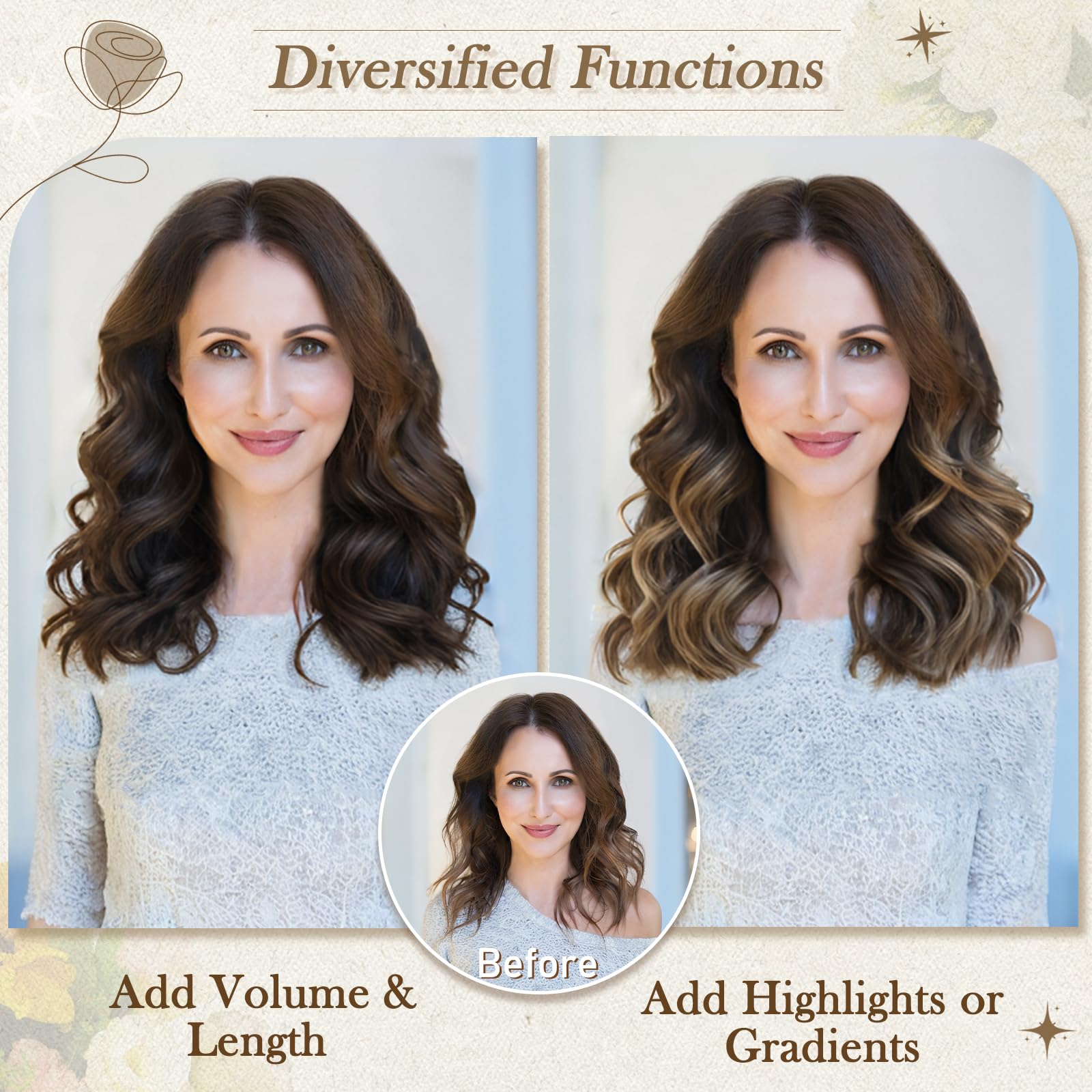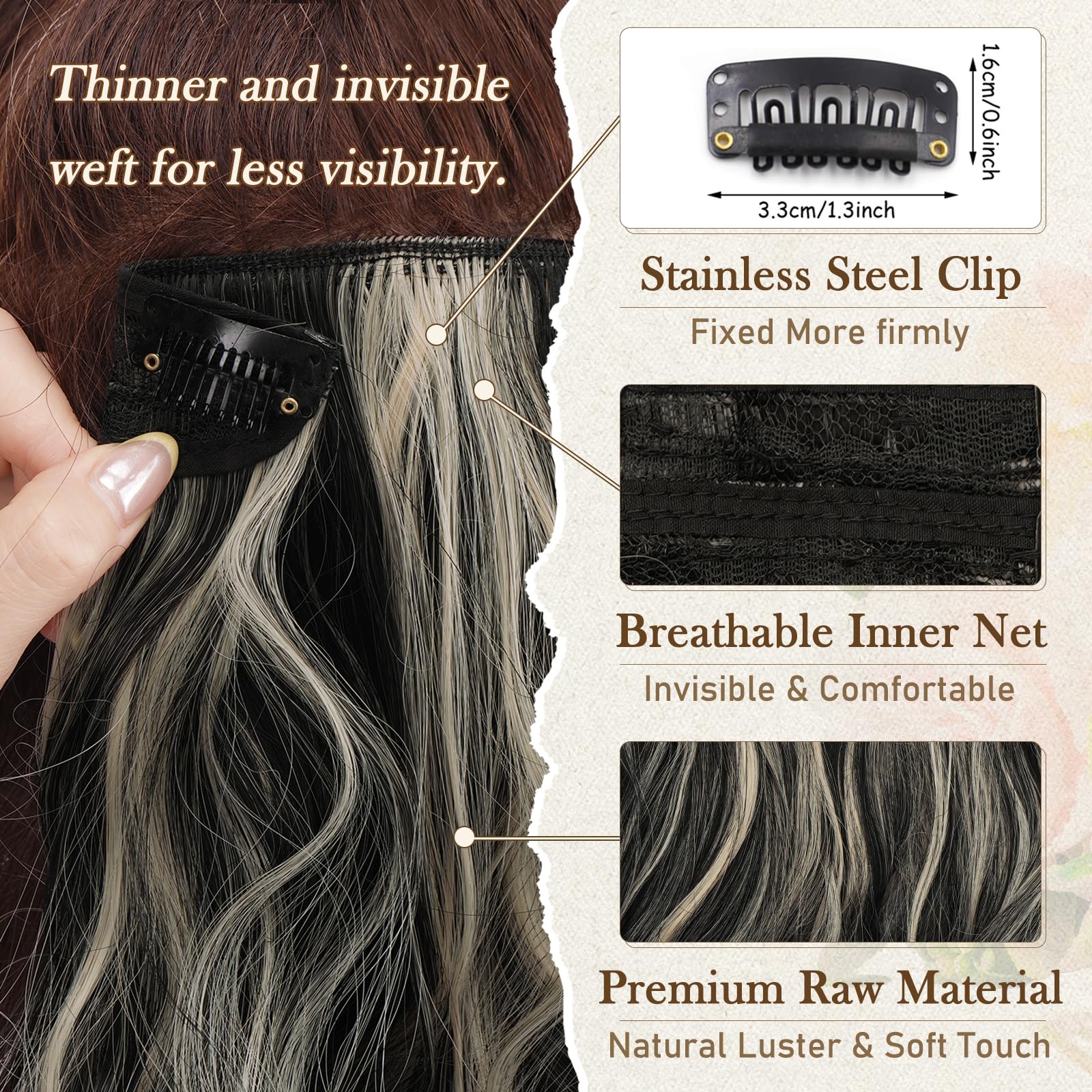 - Soft, Heat-Resistant, and Natural Texture: Made from 100% heat-resistant synthetic fiber for a silky and smooth texture; tangle-free finish blends seamlessly with natural hair to create a voluminous and thick look; equipped with durable stainless steel clips and silicone pads for a secure and gentle grip, reducing scalp strain