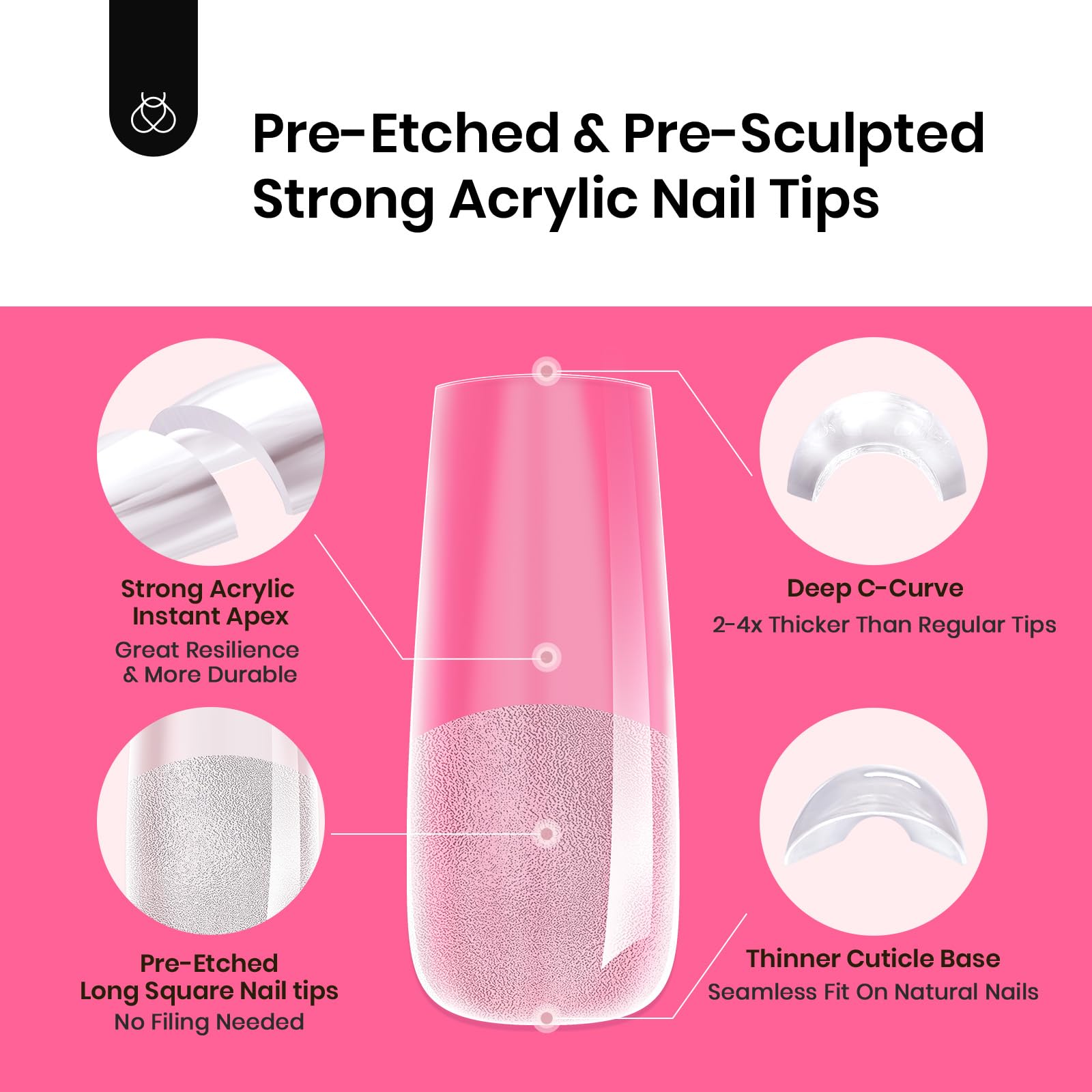 Beetles Tipex Nail Tips Long Square-C Curved Half Matte Nail Tips 224 Pcs Pre Building Fake Nails with Uv Nail Glue, LED Nail Lamp - Thick Acrylic Nail Set for Flat Nails
