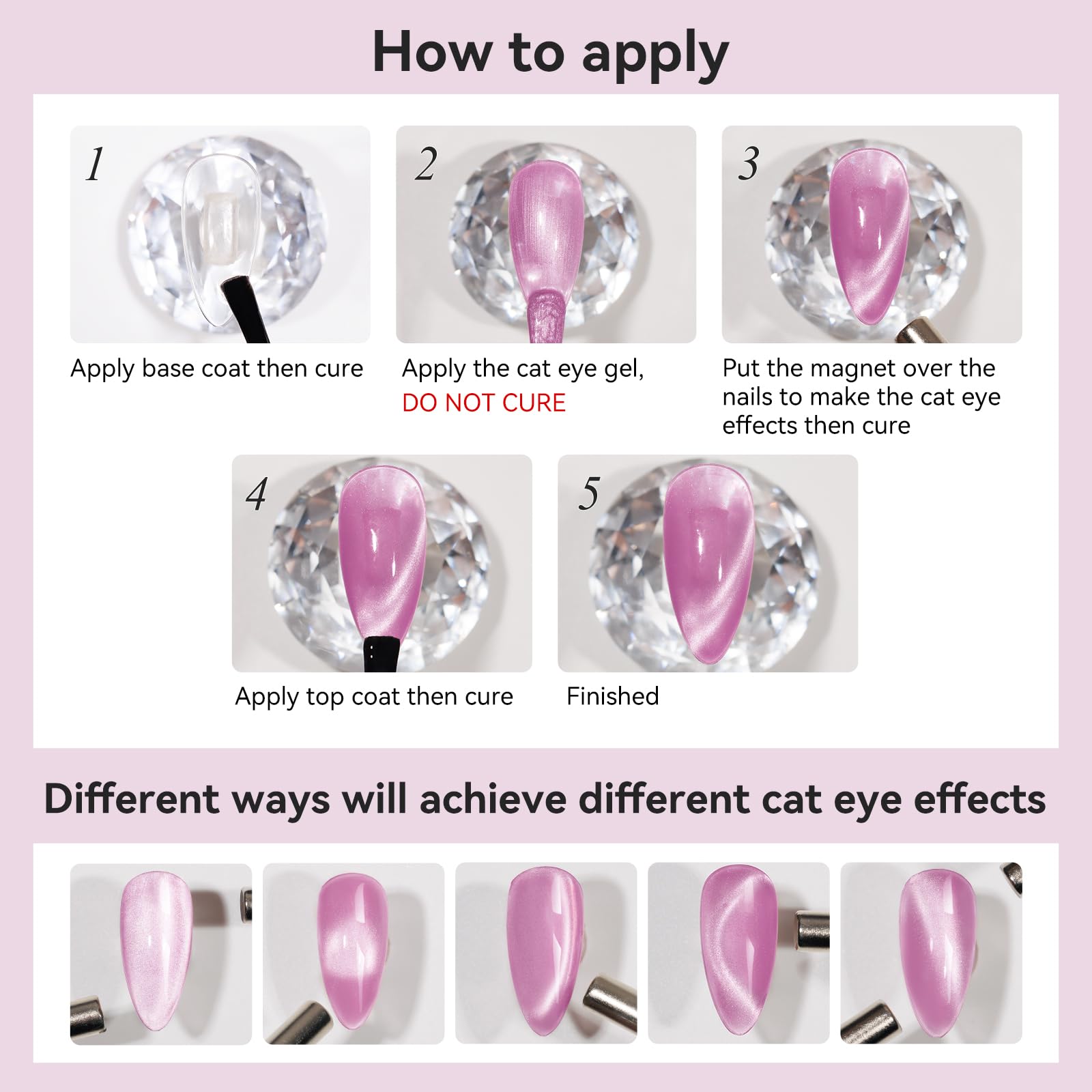 - Warm Tips From Bevimee: 1. This mooncat nail polish needs to use a magnet to get the cat eye effect; 2. This is UV gel nail polish, which requires curing under the nail lamp for 90-120 seconds