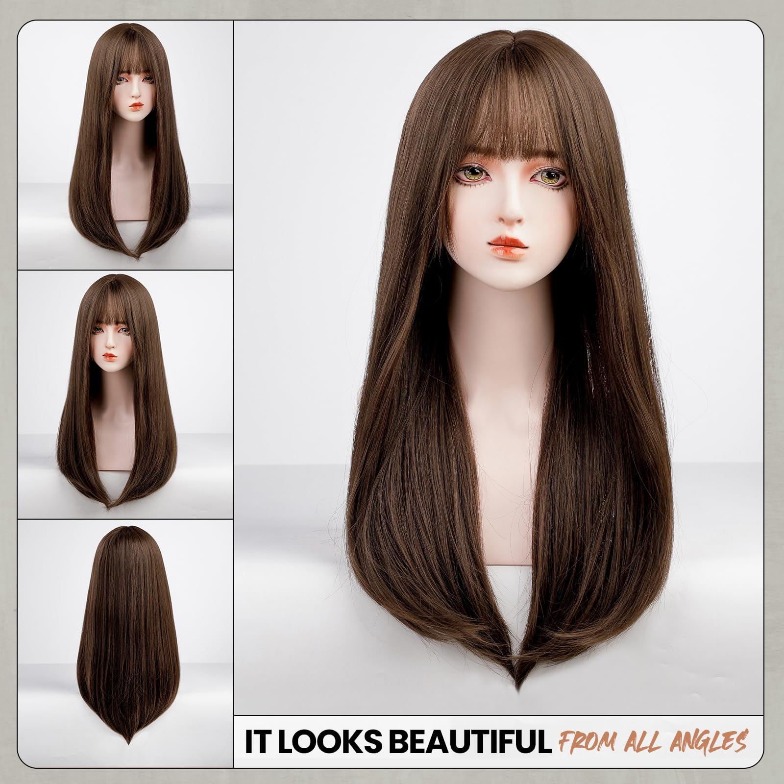 EMMOR Brown Wig With Bangs For Women Long Straight Wigs Synthetic For Girls Halloween Party Cosplay And Daily Use(26" Brown)