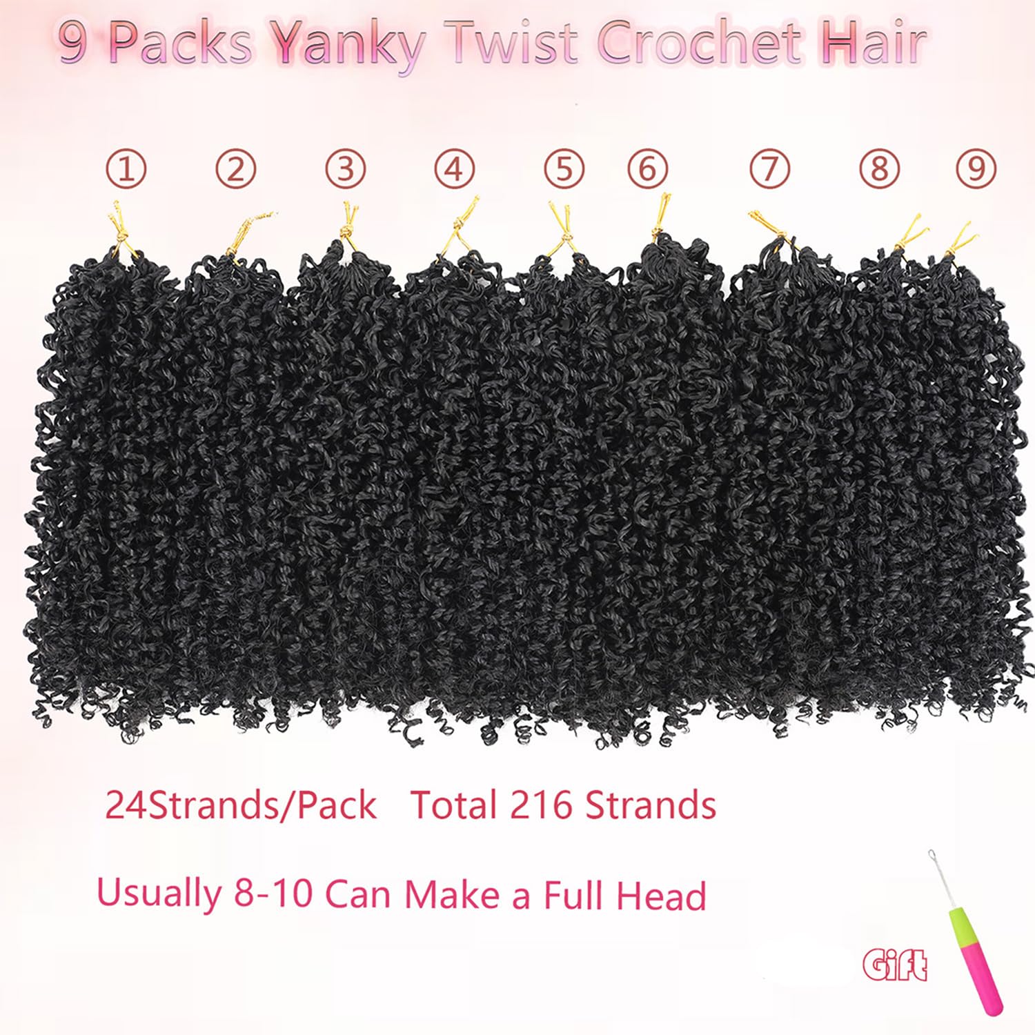- 【8 Inch Pre-twisted Yanky Twist Crochet Hair】 Get Ready to Show off Your charm with Our Beautiful Yanky Twists Braiding Hair Curly Ends! Our New Style Bohemian Yanky Twists Crochet Braids is Pre-Twisted, with Very Natural Little Curls at the Ends, 9 packs/lot, 24 strands/pack, total 216 Strands,Usually 8-10 Packs Can Full One Head.There are many colors to choose from to match your style!