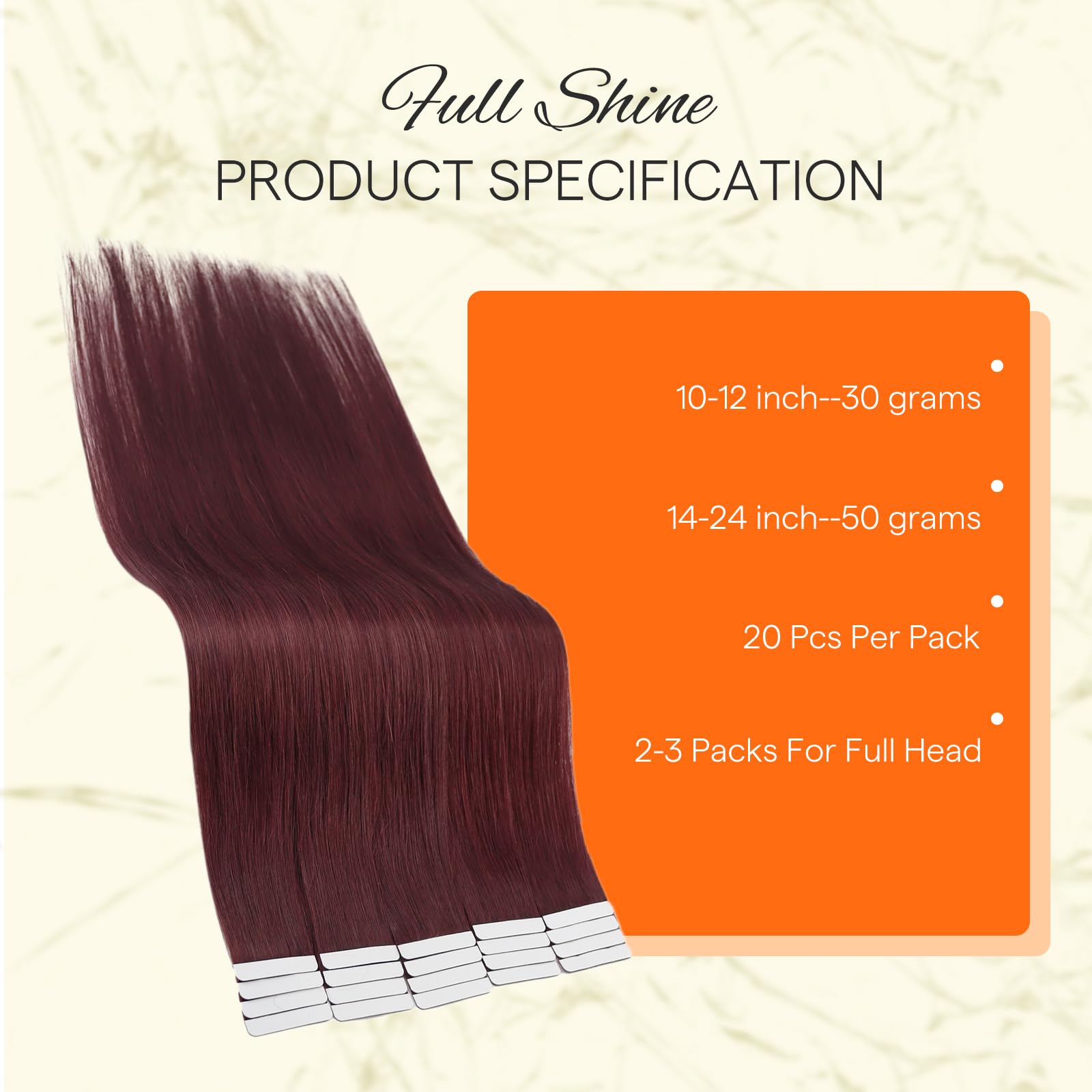 Full Shine Tape in Hair Extensions Human Hair 20PCS Seamless Remy Tape in Extensions Color 99J Red Wine Double Sided Natural Human Hair Burgundy Hair Extensions Tape Ins 12 Inch 30g