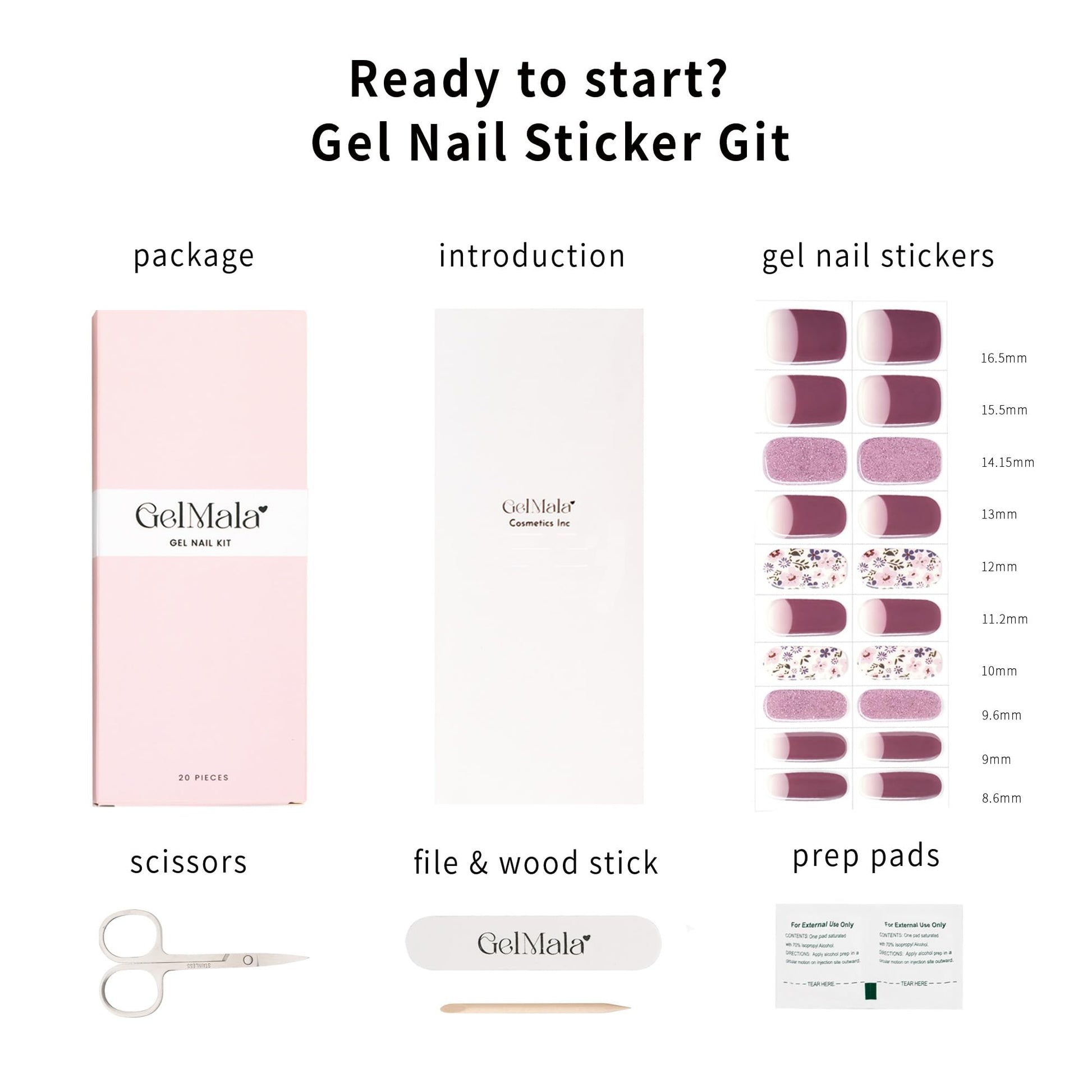 - [ONE SET FIT ALL] Gel Mala gel nail kit includes 20 semi-cured gel stickers for nails, 2 Prep Pads, 1 Nail File,1 Wooden Stick,1 scissors. The set is eco-friendly which is not tested on animals and contains no harsh chemicals.