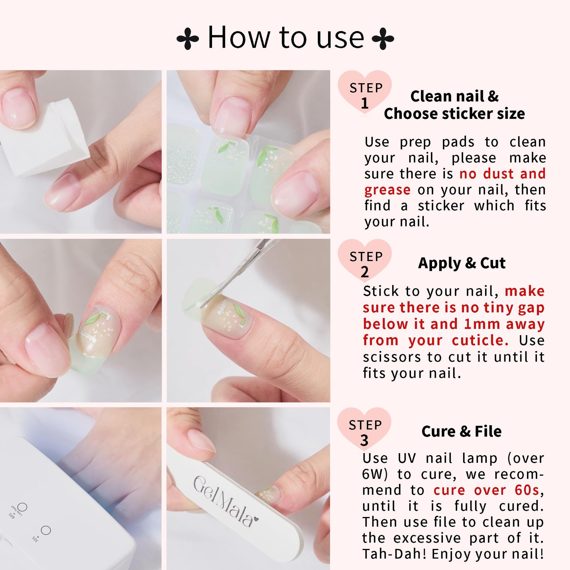 - [LONG-LAST] No worries about chipping off! Gel Mala gel nail stickers with the waterproof top gel layer will last up to 2 weeks once cured under a UV lamp. Before apply the stickers, in oder to have better performance, please make sure your nails are clean, use our prep pads to help.