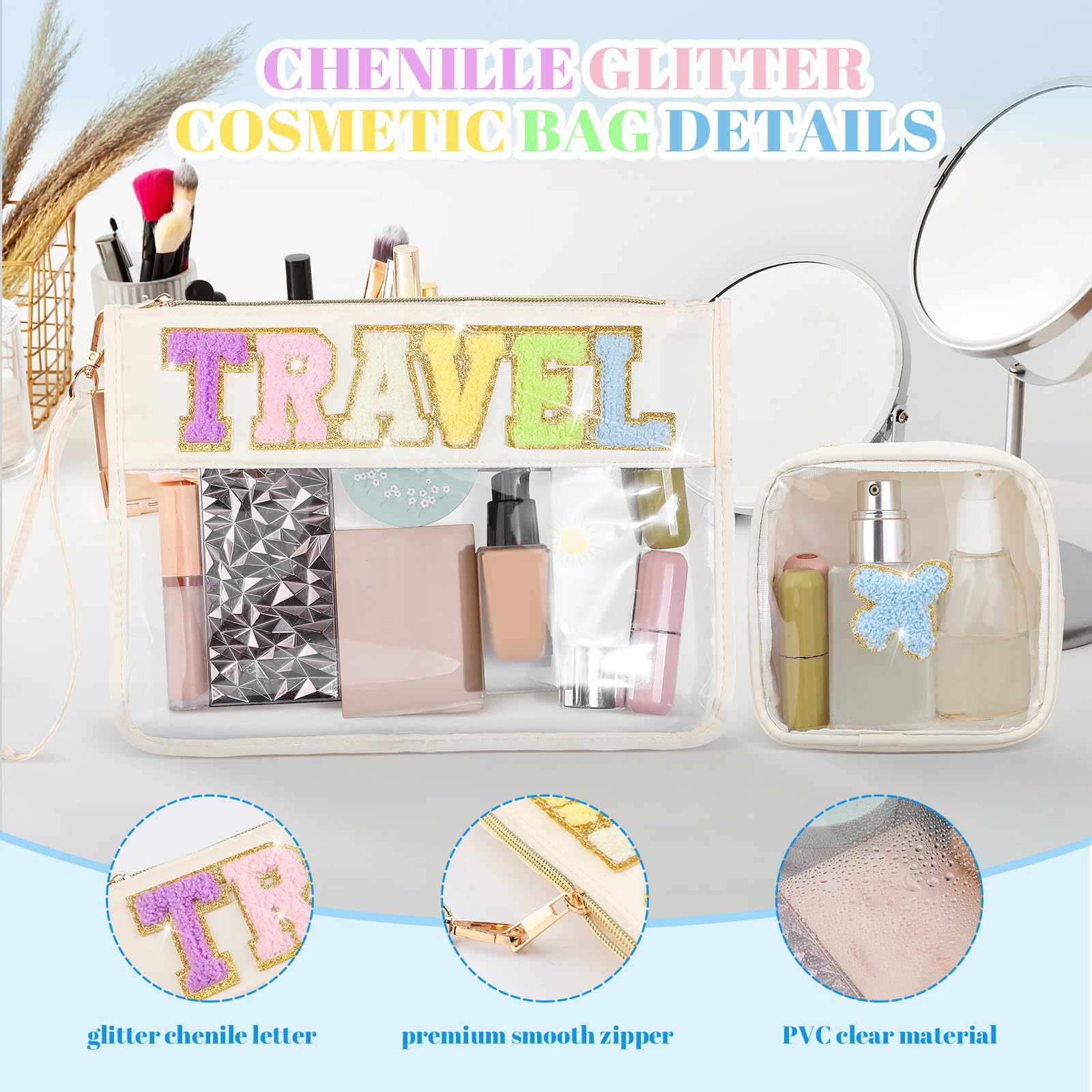 Hillban 2 Pcs Clear Travel Bags Chenille Letter Makeup Cosmetic Toiletry Bags Weekend Gifts Preppy Patch Zipper Pouch for Travel Waterproof Flat Portable Storage Purse for Women