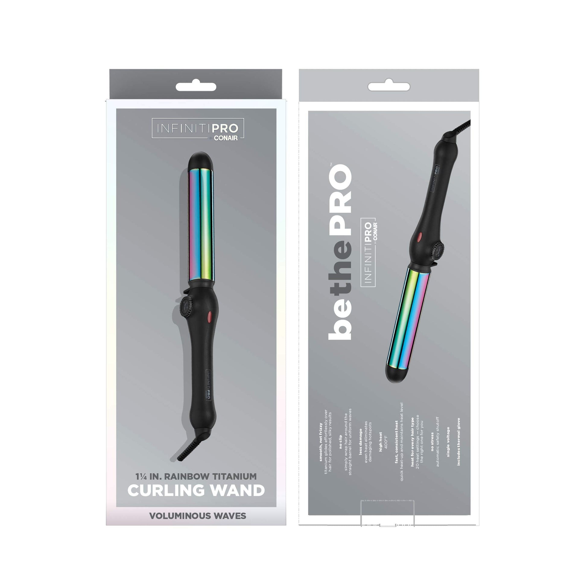 Details: Instantly create defined and free flowing loose curls with the Infiniti Pro by Conair 1 1/4-Inch Rainbow Titanium Curling Wand. The straight barrel creates perfectly uniform waves while heating evenly to eliminate hot spots for less damage. The rainbow titanium reduces frizz and adds shine. With a maximum heat of 400 degrees Fahrenheit and 20 heat settings, there is a setting for every hair type. Also includes an auto off feature, limited three year warranty and bonus insulated thermal glove.