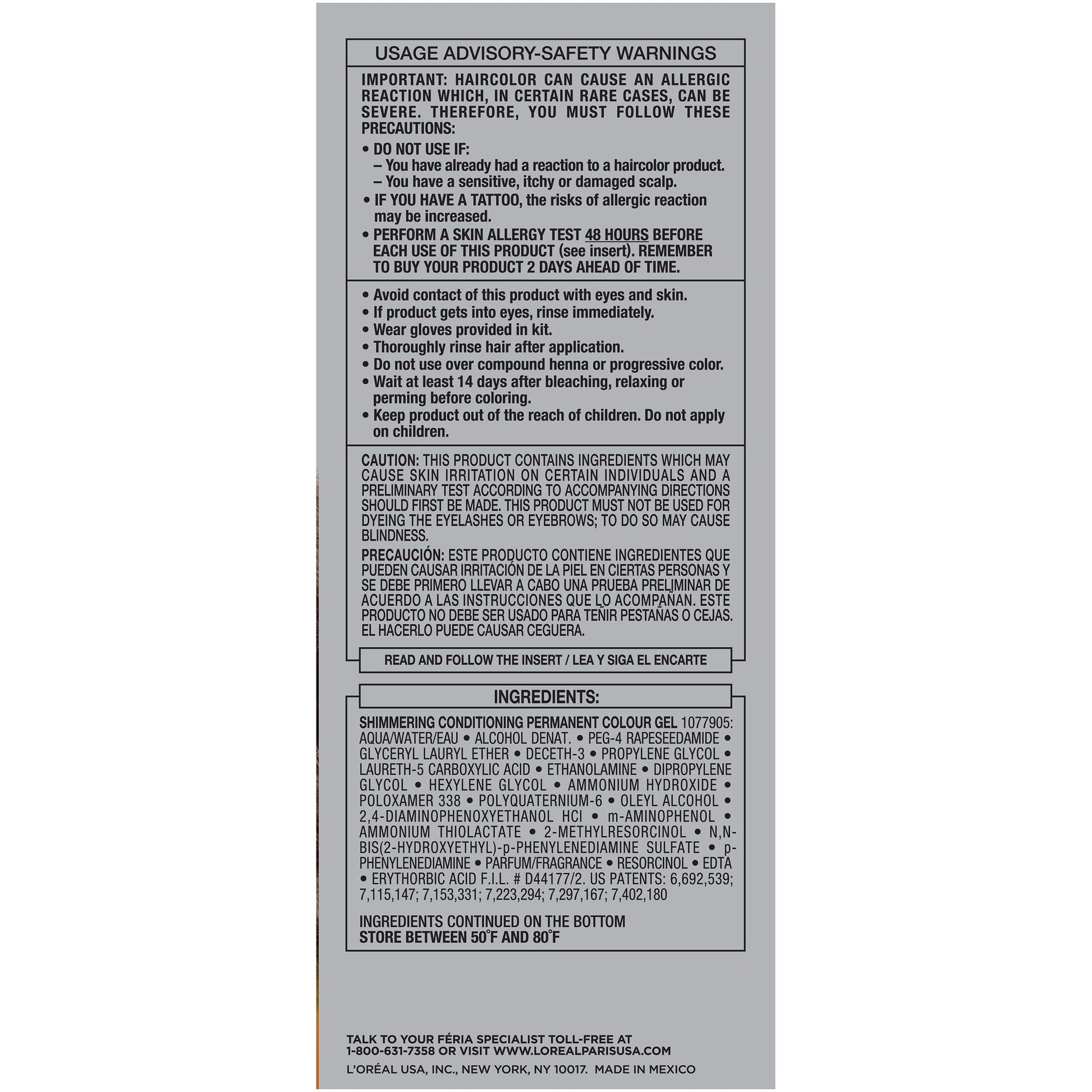 Details: With L'Oreal Feria permanent hair color, what you see is the shimmer. Multi-Faceted shimmering color with 3X highlights delivers intensified, brilliant results. Inspired by fashion, Feria offers a twist on the traditional and gives edgy hair color - from bright red, platinum blonde, rose gold, metallic brown, to blue black hair color, these hair dye kits will transform your hair. Feria's prismatic color spectrum is custom-blended by L'Oreal master colorists for bold, head-turning shades – no appointment necessary. The Power Shimmer Conditioner seals and smooths. Won't wreck or ravage hair.