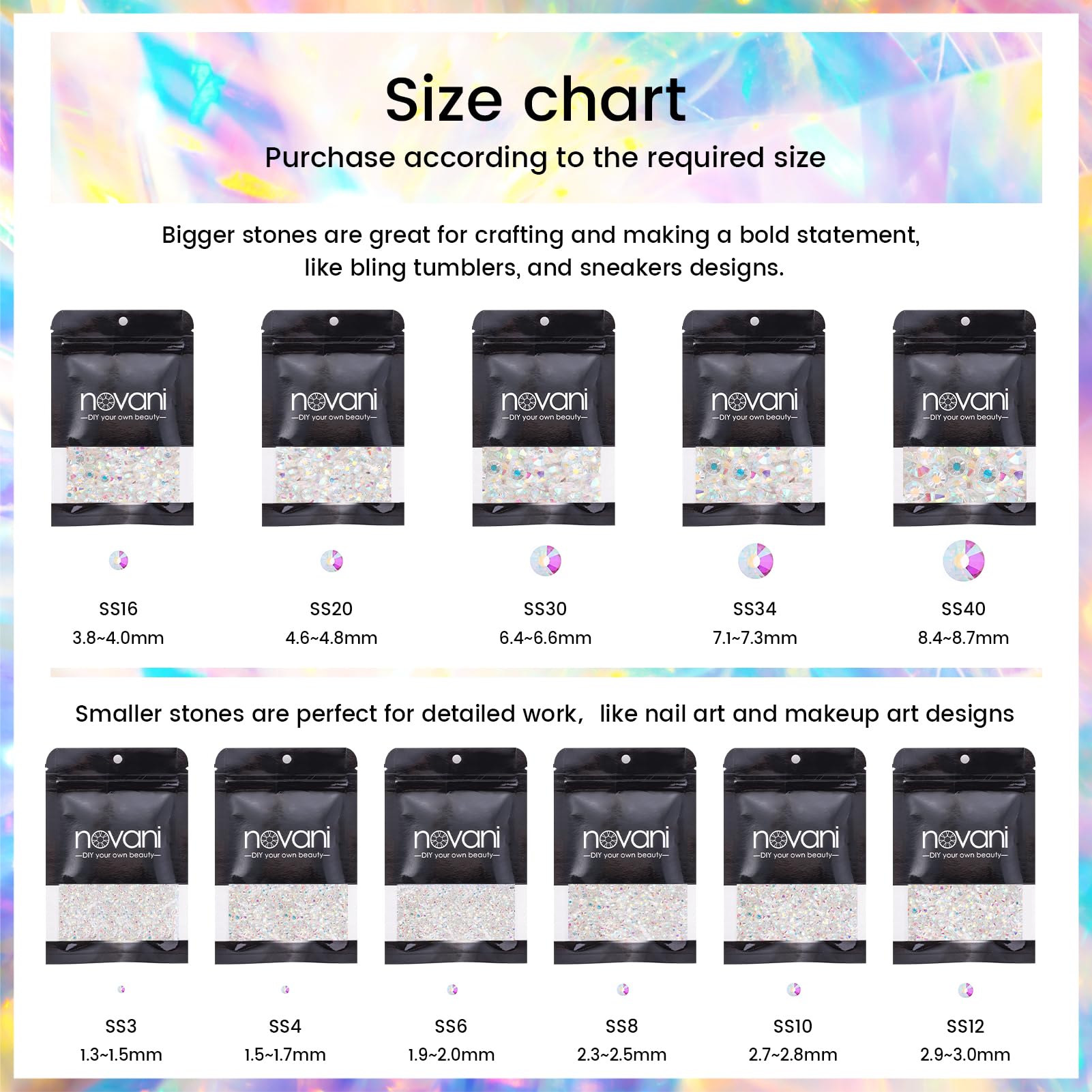 - Rhinestones for crafting: novani rhinestones are suitable for crafts, clothes, festival costumes, shoes, nail and face art, eye makeup, body art, bags, mobile phone cases, tumblers, cups, and other decoration needs