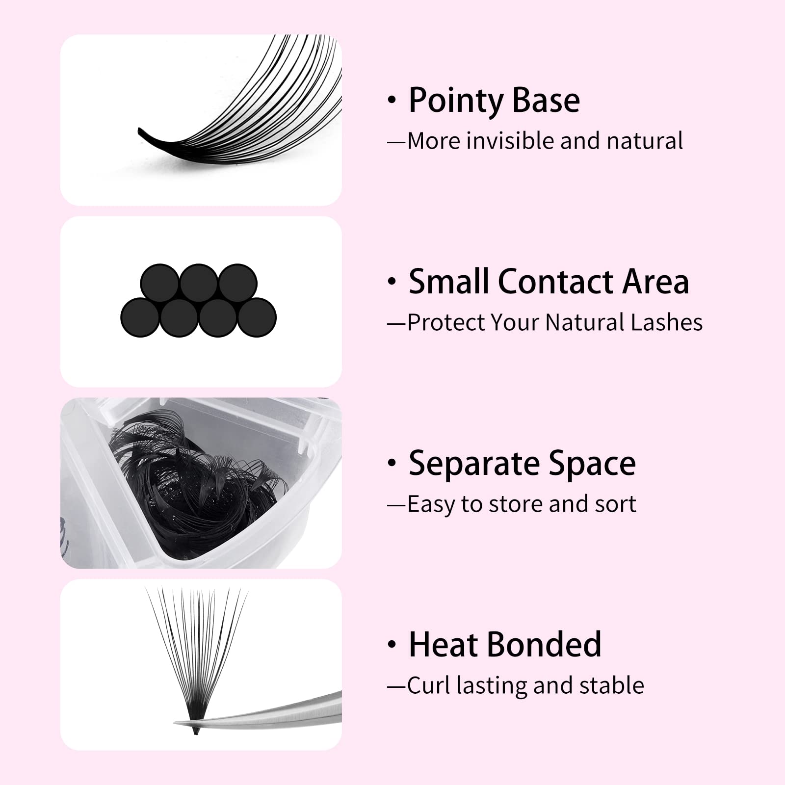 - Easy to use: Loose fans lash extensions are easier to use while working compared to normal tape lash extension trays. You can quickly pick up and apply eyelash premade fans with tweezers, the premade fans are not attached to the tape, the premade fans won't fall apart, and lash extensions are clean without residue.