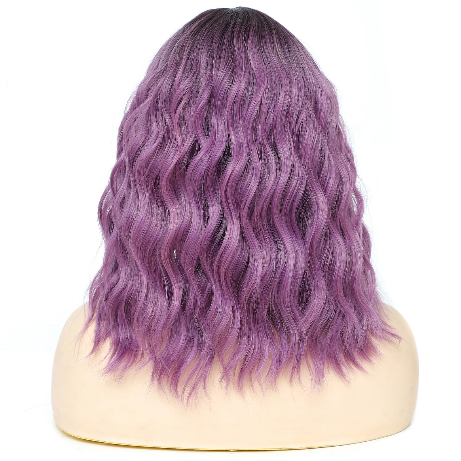 Rose bud Wavy Bob Wig Natural Wig Ombre Purple Synthetic Hair Shoulder Length Short Curly Middle Part Lace Front Wigs for Women