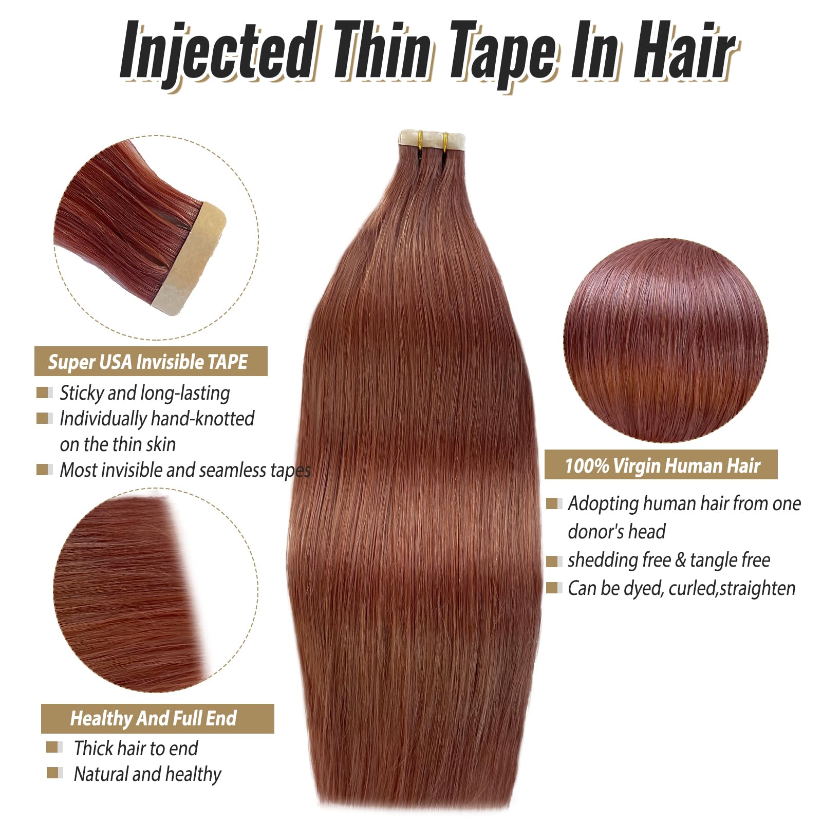Tape in Hair Extensions Human Hair 14 Inch Glue in Remy Hair Extensions Auburn Brown Color Fashion Tape in Extensions for Women Double Side Invisible Tape in Human Hair Extensions 20Pcs 30Gram